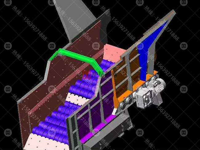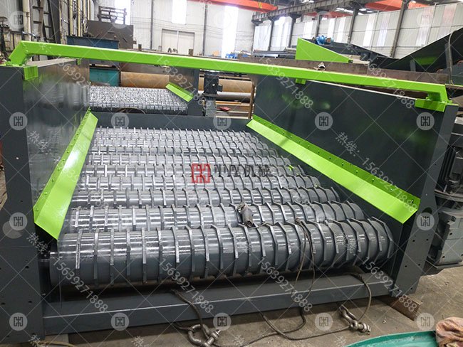 由電機(jī)驅(qū)動(dòng)帶有不規(guī)則的形狀裝置的連動(dòng)軸進(jìn)行翻轉(zhuǎn)運(yùn)動(dòng),篩面由很多根直線排布回轉(zhuǎn)軸承構(gòu)成,在滾軸上有相等的篩盤排布,滾軸通過齒輪帶動(dòng)輪鏈傳動(dòng)而旋轉(zhuǎn)的,其旋轉(zhuǎn)的的方向與原料流動(dòng)的方向一致,軸與軸之間有間隙,鑲嵌在軸上的不規(guī)則耐磨裝置托起大粒度物料向前運(yùn)動(dòng),因?yàn)楹Y軸是按各不相同的運(yùn)行方向設(shè)計(jì)的,所以當(dāng)材料在運(yùn)行方向較高的地方運(yùn)行時(shí)的速度較快;當(dāng)材料在運(yùn)行方向較低的地方運(yùn)行時(shí)的速度較低緩。兩種各不相同的速度運(yùn)行下的材料,在篩面某一地方相匯時(shí)開始做軸向運(yùn)作,如此一來就使材料均衡性地分布在篩面上,達(dá)到了提高篩分的工作效率,小顆粒物料則落入分離機(jī)底部由皮帶機(jī)送出。