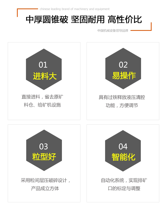 | 中厚圓錐破碎機外形美觀,堅固耐用,層壓破碎,抗壓強度高 |